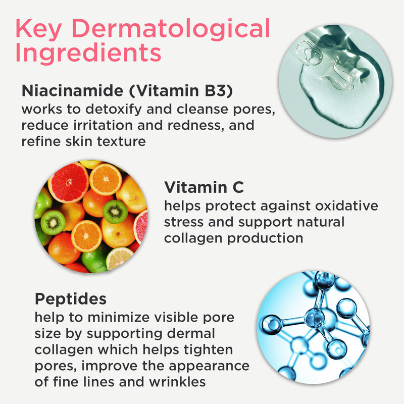 حتوي هذا السيروم شديد التركيز على نياسيناميد عالي الفعالية بنسبة 15% (فيتامين ب3) وفيتامين ج وببتيدات لتضييق المسام وحماية البشرة من الأكسدة ومحايدة الجذور الحرة ودعم إنتاج الكولاجين. كما يحتوي على الزنك الذي يزيل الدهون الزائدة التي تسد المسام والمسؤولة عن توسيع حجمها. ويساعدكم هذا السيروم في الحصول على بشرة خالية من العيوب بدون مكياج ويمكن وضعه كطبقة أساسية قبل المكياج.