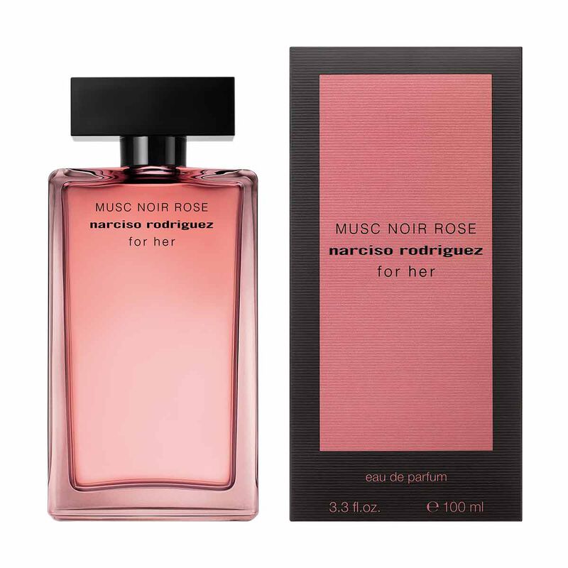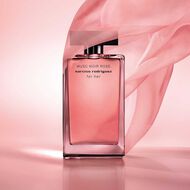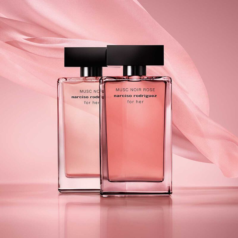 كاشفةً عن لون السائل العطري ذي اللون الوردي المُركز بداخلها، تعكس القارورة شبه الشفافة الطابع الحسي الرقيق واللمسة الدافئة لأو دو بارفان فور هير مسك نوار روز النسائي الجديد.