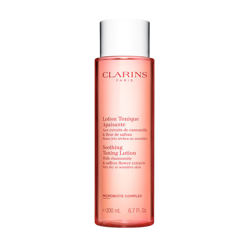 Enriched with the [Clarins Microbiota Complex], it naturally rebalances the skin flora. Soothing Toning Lotion from Le Domaine Clarins, in the Alps.